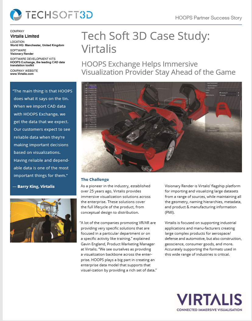 Leading Augmented and Virtual Reality applications rely on HOOPS SDKs from Tech Soft 3D to provide the foundations for their development. From accessing rich CAD data to rendering large models, learn how HOOPS SKDS can jump start your development process.